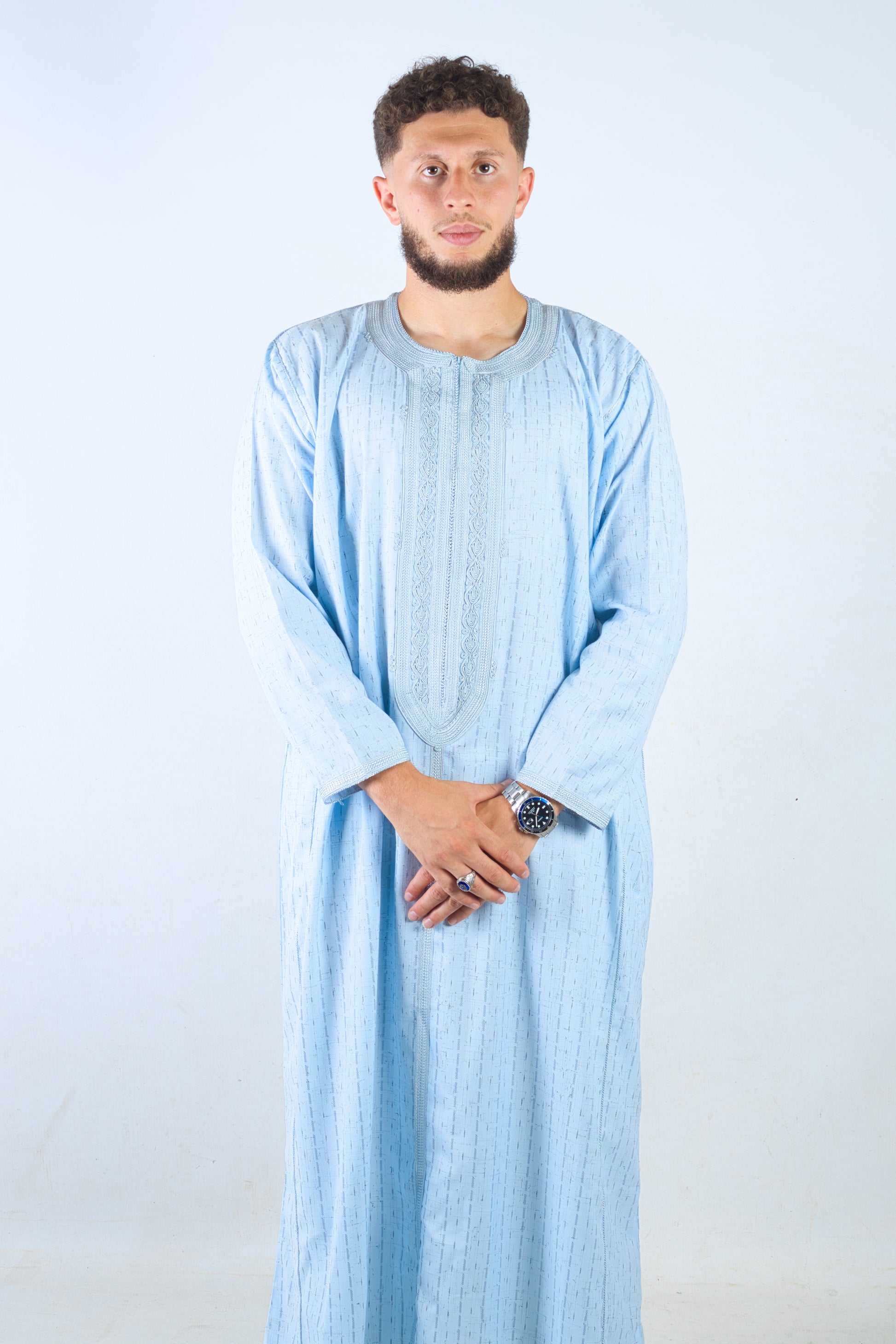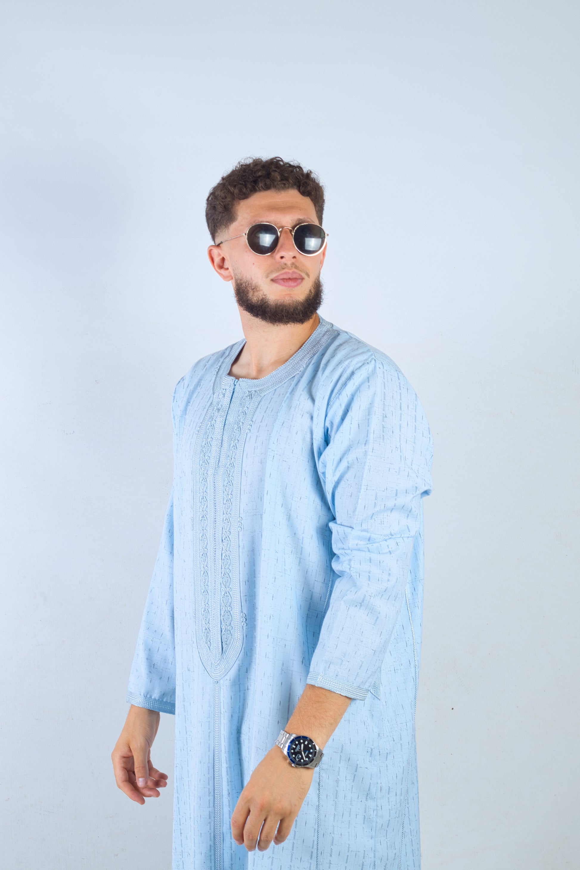 Un bleu profond qui rappelle la sérénité des nuits étoilées. Chaque qamis est confectionné avec soin, pensé pour accompagner vos moments importants comme vos instants simples du quotidien.
