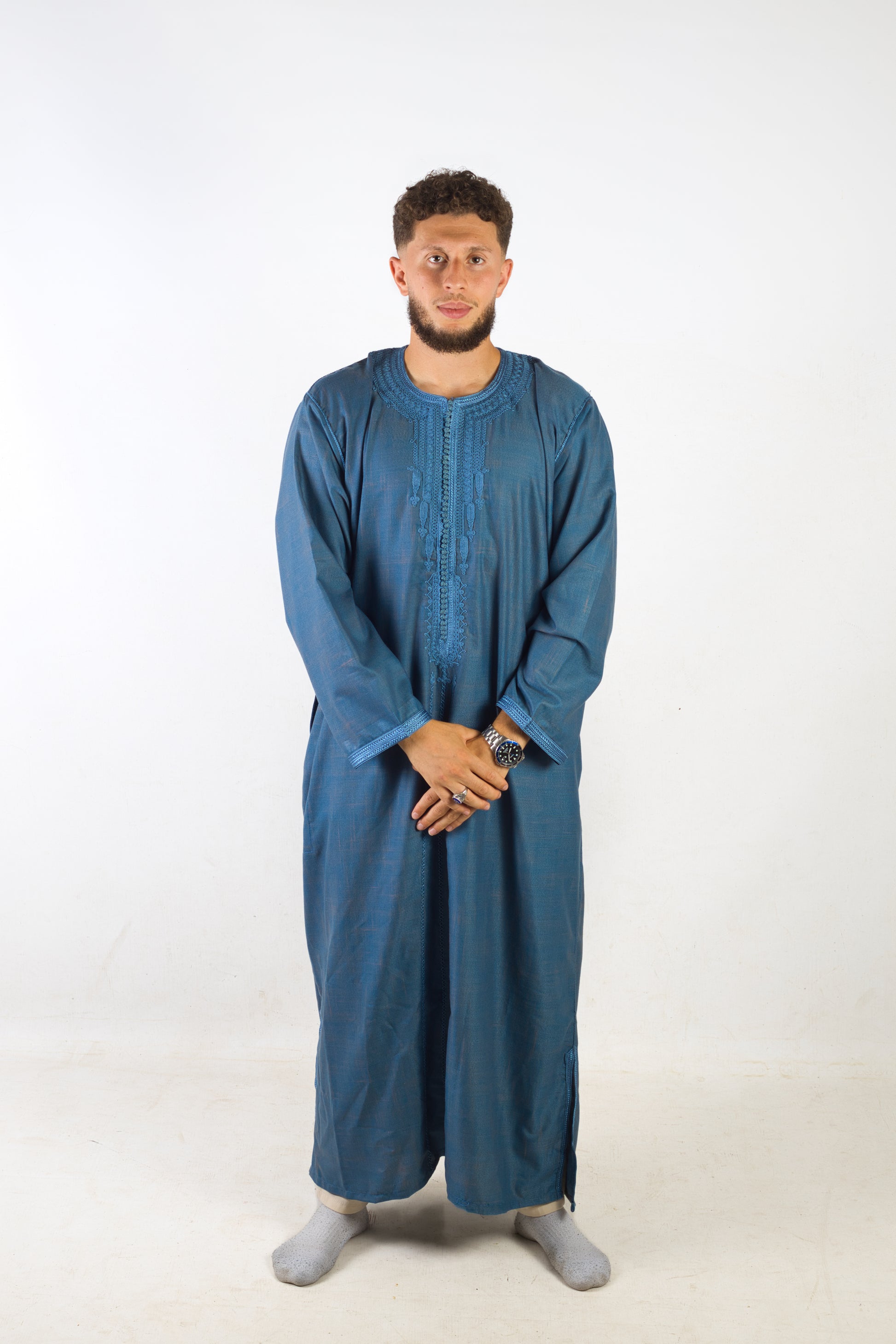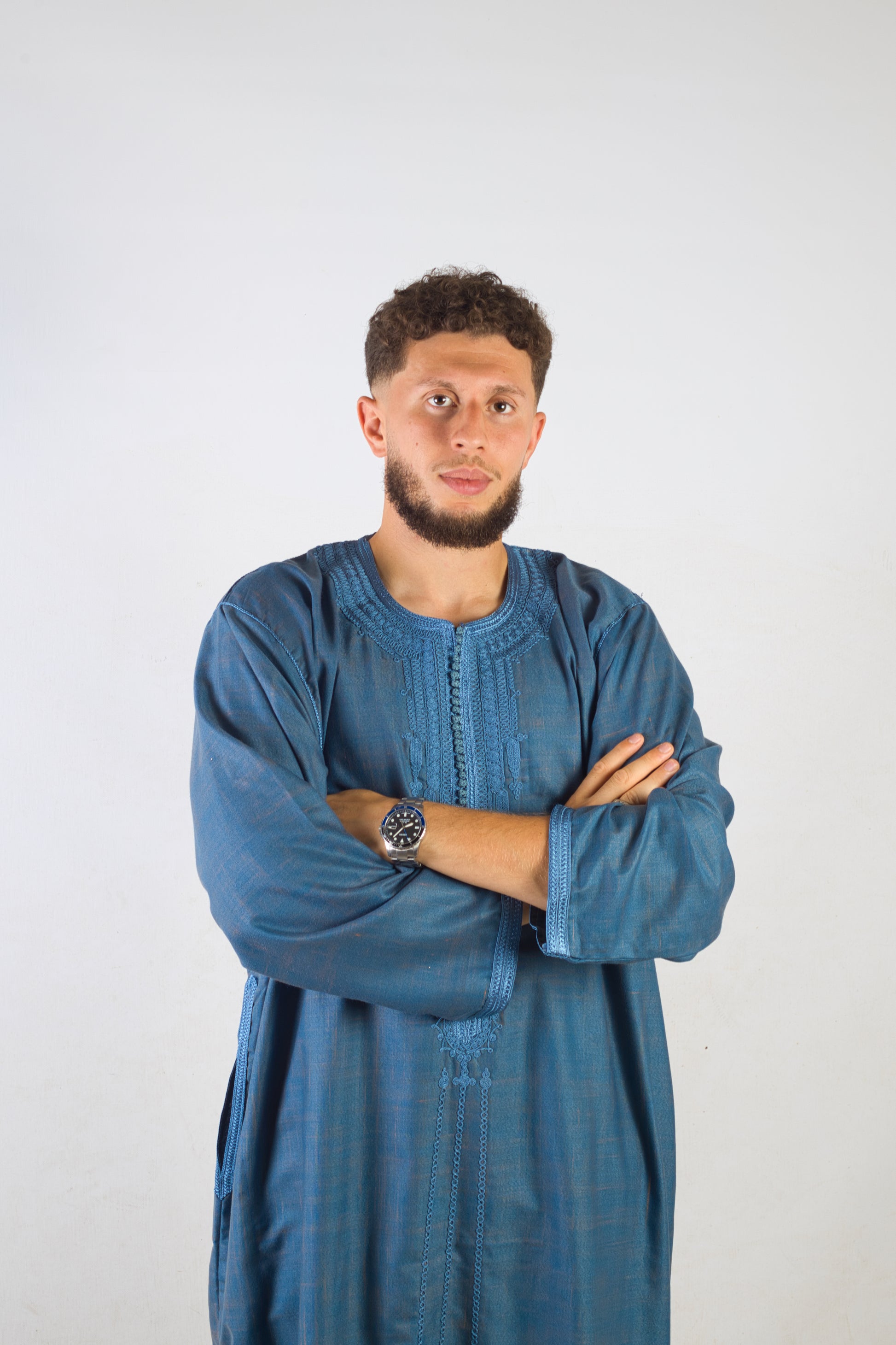 Un bleu profond qui rappelle la sérénité des nuits étoilées. Chaque qamis est confectionné avec soin, pensé pour accompagner vos moments importants comme vos instants simples du quotidien.
