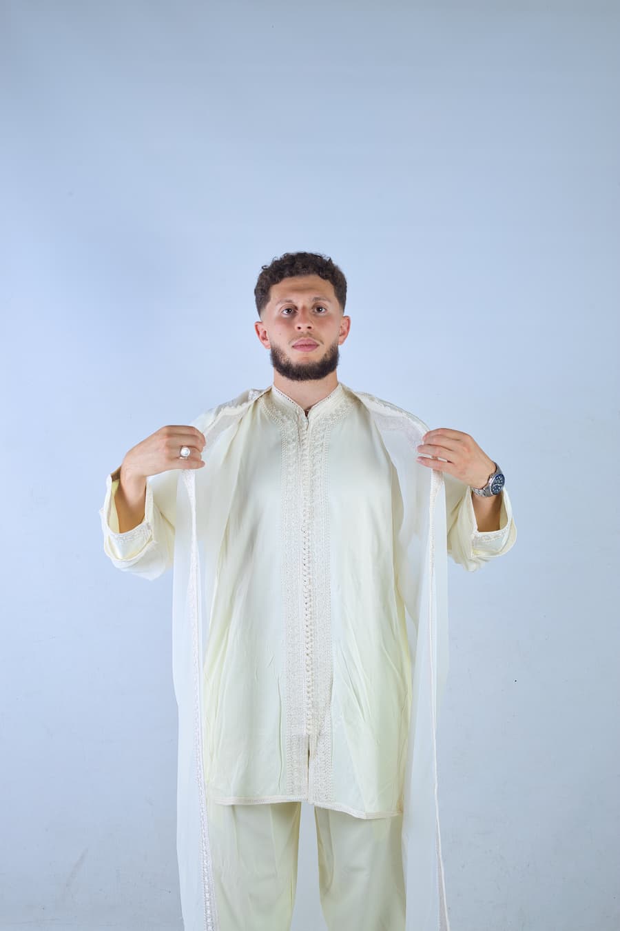 Un bleu profond qui rappelle la sérénité des nuits étoilées. Chaque qamis est confectionné avec soin, pensé pour accompagner vos moments importants comme vos instants simples du quotidien.
